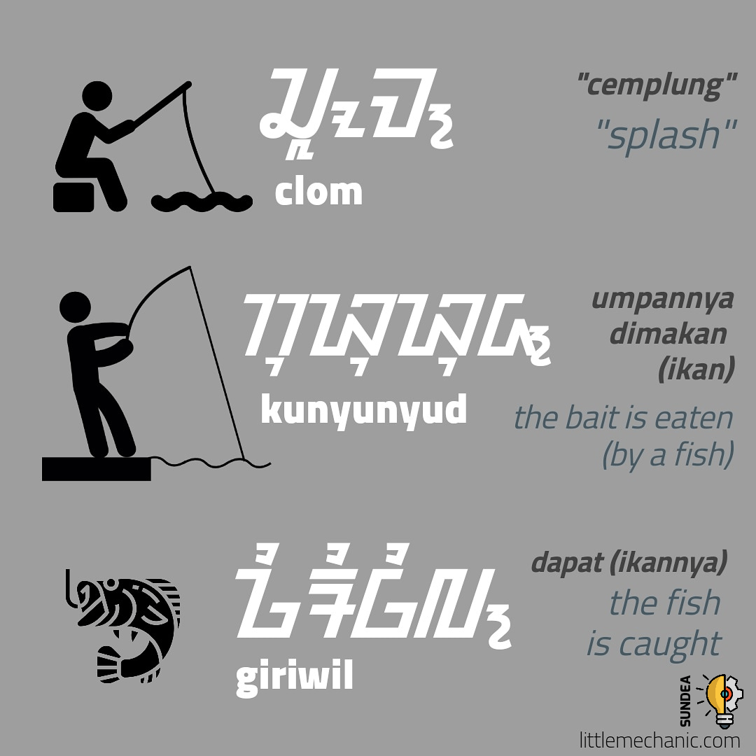 Clom adalah efek suara ketika sesuatu masuk ke dalam air. Macam cemplung. Kunyunyud juga efek suara ketika sesuatu (misalnya tali pancing) menjadi tegang karena tertarik. Dan giriwil juga efek suara ketika kita berhasil mendapatkan atau menangkap sesuatu 😁