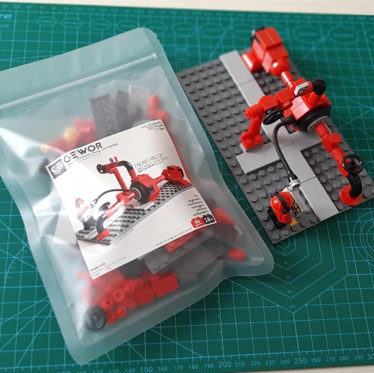 - Free product name display made of LEGO with sticker.