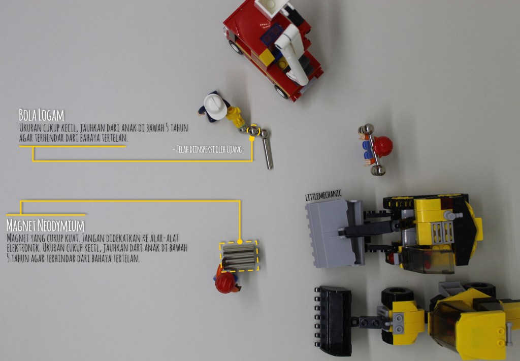 Dari hasil inspeksi Kang Ujang, nampak udah mulai jelas nih sobat-sobat, bahwa yang lagi dikumpulin para mekanik kecil ini adalah dua jenis bahan yang akan digunakan sebagai mainan edukatif. Bahan pertama berupa stik magnet neodymium, dan bahan kedua adalah bola logam. Mainan edukatif kaya gimana ya yang bakal mereka kerjain?